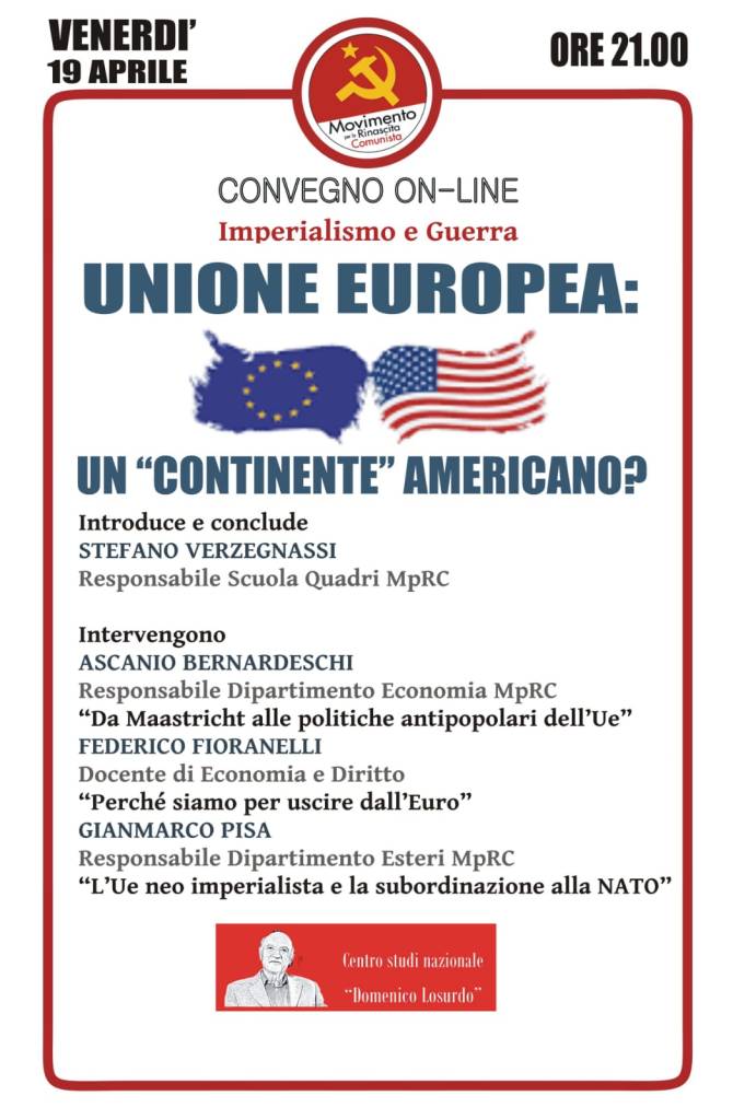 Di tutti questi temi si parlerà al Convegno on – line che la Scuola Quadri del MpRC, diretta dal compagno Stefano Verzegnassi, ha organizzato per venerdì 19 aprile, ore 21.00. Interverranno al dibattito, che sarà aperto e concluso dallo stesso Verzegnassi, anche membro della segreteria nazionale del MpRC, Ascanio Bernardeschi, responsabile Dipartimento Economia del MpRC, che affronterà il tema del terribile impatto sociale, in Italia e in diversi altri Paese dell’Ue, dei dettami di Maastricht; Federico Fioranelli, giovane docente di Economia e Diritto e del Gruppo di Lavoro sulle questioni economiche del Centro Studi Nazionale “Domenico Losurdo”, Fioranelli che chiarirà i motivi per cui occorre uscire dall’Euro, e Gianmarco Pisa, responsabile del Dipartimento Esteri del MpRC, che affronterà il tema della spinta alla guerra che caratterizza il neoimperialismo dell’Ue e, contemporaneamente, la sua subordinazione alla Nato e i motivi per i quali i comunisti debbono essere contrari alla formazione dell’esercito europeo.