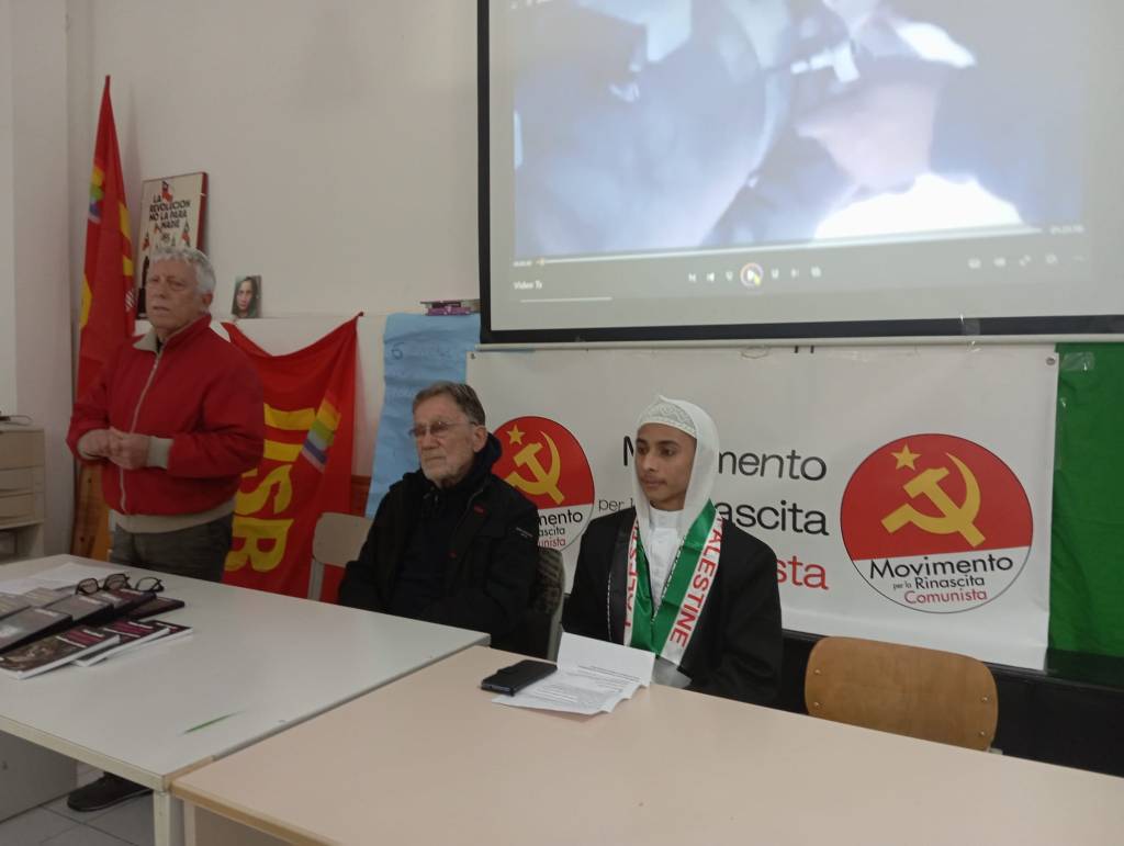 Introdotta da Stefano Tenenti, del Coordinamento Nazionale Movimento per la Rinascita Comunista, la serata ha registrato anche l’intenso intervento del giovane Imam Hafez Abir Sharkar, studente presso l’Università Islamica Araba, che ha “illuminato” con insolita lucidità analitica e passione “la questione palestinese”, sottolineando con forza la natura eroica della lotta del popolo palestinese, la natura fascista, oscura, reazionaria dell’attuale sionismo che guida Israele, la ferocia degli Usa e dell’Ue nei confronti del popolo palestinese e, tuttavia, “l’immenso appoggio alla causa palestinese che sta provenendo da ogni popolo del mondo, una solidarietà planetaria che, assieme alla resistenza senza fine dei palestinesi e il cambiamento dei rapporti di forza internazionali a favore del fronte antimperialista, annuncia la vittoria del popolo palestinese”.