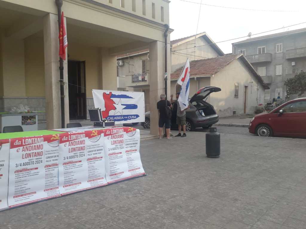 Tripodi è alla testa del lavoro: la sua elegante camicia azzurra è già zuppa di sudore. Lavorano tutti. Pasquale cantando. Pietro “il cubano” (nel senso che è il più impegnato nell’attività pro-Cuba per il MpRC) in serio silenzio da Terza Internazionale. Arriva il compagno Lorenzo Fasci’ e lo aiutiamo a scaricare dalla macchina le enormi casse per l’amplificazione. Poiché non solo dibattito, stasera, ma musica e ballo in piazza! Tra l’altro, Fasci’ è sceso, da Reggio Calabria sino a Condofuri, tre volte negli ultimi giorni per parlare con la gente del paese e far riuscire la Festa!