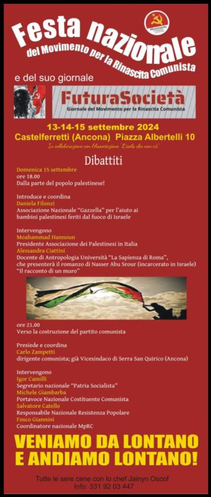 14 settembre 202413 settembre 2024 Blog Movimento Festa nazionale MpRC Castelferretti (An) il programma di domenica 15 settembre Condividi: Fai clic per condividere su X (Si apre in una nuova finestra) X Fai clic per condividere su Facebook (Si apre in una nuova finestra) Facebook Mi piace Caricamento... Correlati