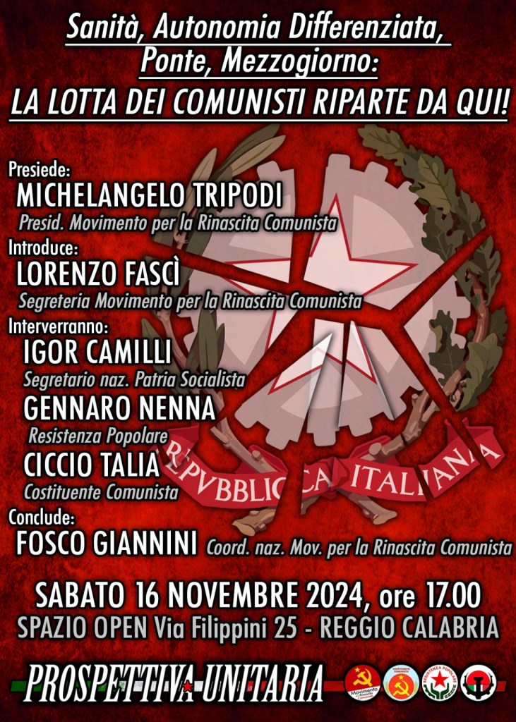 La prima delle quattro manifestazioni nazionali, questa organizzata dal MpRC, si terrà sabato 16 novembre a Reggio Calabria. Già il titolo scelto per la manifestazione (“Sanità, Autonomia differenziata, Ponte, Mezzogiorno/ La lotta dei comunisti riparte da qui!”) da esattamente la cifra politica del progetto strategico di Prospettiva Unitaria, un progetto volto ad unire, radicare ed organizzare i comunisti nelle lotte, nella realtà concreta delle cose, nella società e tra i lavoratori. La lotta per la difesa ed il rilancio della Sanità pubblica, specie nel Sud d’Italia, specie in Calabria, dove per tenere aperti servizi fondamentali della devastata Sanità pubblica è stato necessario ricorrere all’opera di centinaia di medici cubani, è la prima questione che la manifestazione di Reggio Calabria di Prospettiva Unitaria vuole affrontare. Una lotta altrettanto determinata dovrà essere, innanzitutto dai comunisti uniti, lanciata contro l’Autonomia differenziata, un’orrenda merce di scambio tra una Lega sempre più volta alla feudalizzazione del Paese, ad una sempre più netta divisione tra un’Italia più benestante, del nord, e un’Italia ben più povera, del Sud, e Fratelli d’Italia di Giorgia Meloni, che punta ad un premierato come anticipazione di un regime autoritario, antidemocratico e antioperaio. Come una sempre più vasta mobilitazione popolare dovrà essere sostenuta, dai comunisti, da Prospettiva Unitaria, contro il Ponte sullo Stretto, vera ossessione reazionaria del ministro Salvini e vera, ed eventuale, sciagura per tutto il popolo del Meridione che, col Ponte, vedrebbe realizzata un’ opera folle, inutile e già fatiscente sin dalla nascita e la cancellazione di ciò che davvero servirebbe e serve alla Calabria e a tutto il Meridione: nuove infrastrutture ferroviarie, stradali e portuali (ammodernamento, raddoppio ed elettrificazione della ferrovia jonica, alta velocità Salerno – Reggio Calabria, autostrada della jonica, potenziamento porto Gioia e Tauro, ecc.) all’altezza dei tempi e come necessaria parte di un intero progetto di costruzione di infrastrutture degne di un Paese contemporaneo e civile che ora del tutto mancano in Calabria e in tutto il Mezzogiorno e la cui assenza è una delle maggiori basi materiali del mancato sviluppo del Sud d’Italia.