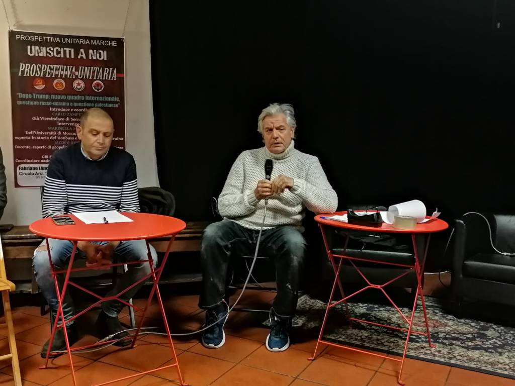 Si è svolto con grande successo a Fabriano (Ancona), giovedì 12 dicembre, presso la sede dell’Arci “Il Corto Maltese” un importante convegno pubblico dal titolo “Dopo Trump: nuovo quadro internazionale, questione russo-ucraina e questione palestinese”. Il convegno, organizzato da Prospettiva Unitaria (PU, che ha già svolto a Firenze e Reggio Calabria due delle quattro manifestazioni nazionali – le prossime a Milano e Campobasso – che la porteranno alla manifestazione nazionale del prossimo 25 gennaio 2025 a Roma, presso il Teatro Flavio) è stato davvero molto partecipato, con la presenza largamente maggioritaria, tra l’altro, di giovani. Una forte presenza giovanile che, assieme ad una significativa presenza operaia e intellettuale dell’area fabrianese e anconetana, ha permesso si costituisse, in sala, un “clima” di densa partecipazione politica ed emotiva, con gli interventi dei relatori davvero seguiti e con un conseguente dibattito del pubblico ricco quanto le stesse relazioni. Il convegno è stato aperto dal compagno Carlo Zampetti, già Vicesindaco di Serra San Quirico (un paese prossimo a Fabriano), storico dirigente comunista dell’area Fabriano-Ancona, coordinatore del Movimento per la Rinascita Comunista di Fabriano ed ora anche dirigente di Prospettiva Unitaria. Zampetti ha mirabilmente proposto agli altri relatori e alla stessa platea, delineando un quadro generale delle attuali contraddizioni internazionali segnate dalla pulsione alla guerra degli Usa e della Nato, una densa “piattaforma” di discussione, raccolta poi sia dai successivi relatori che dagli interventi dal pubblico. Dopo Zampetti ha svolto la propria relazione, di grande spessore, il professor Jacopo Quirini, esperto di questioni geopolitiche e della questione palestinese. Quirini ha costruito il suo intervento attorno all’idea-guida di una potente contraddizione economica mondiale in atto tra fronte imperialista e antimperialista, che oggi determina ogni focolaio di guerra, inserendo anche il “golpe” filoamericano del 2014 a Kiev, “sorretto dalla Nato, dal Battaglione Azov e dagli altri battaglioni nazifascisti e banderisti”, in questo duro contesto di scontro economico tra fautori di un ritorno all’unilateralismo (gli Usa, l’Ue e l’intero fronte imperialista) e i fautori del multilateralismo (la Cina, la Russia e l’intera area mondiale Brics).