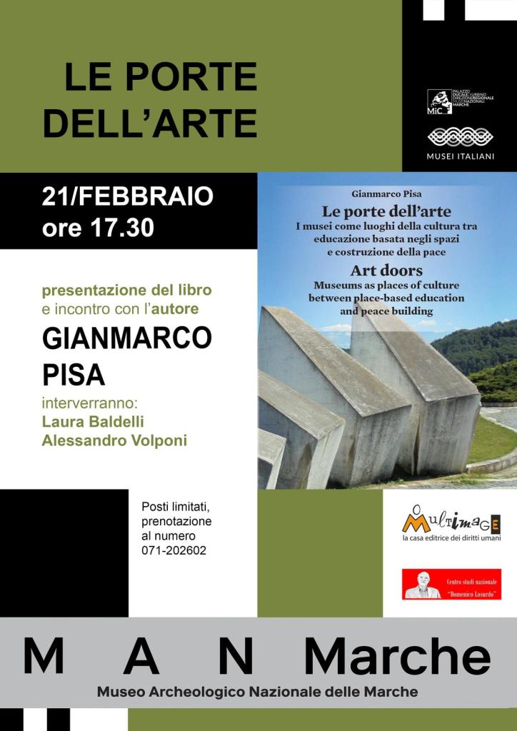 Venerdì 21 Febbraio ad Ancona il Centro Studi Domenico Losurdo presenterà il nuovo saggio del nostro compagno Gianmarco Pisa Le porte dell’arte. I musei come luoghi della cultura basata negli spazi e costruzione della pace, edito da Multimage Firenze, presso la prestigiosa sala conferenze del Museo Nazionale Archeologico delle Marche.