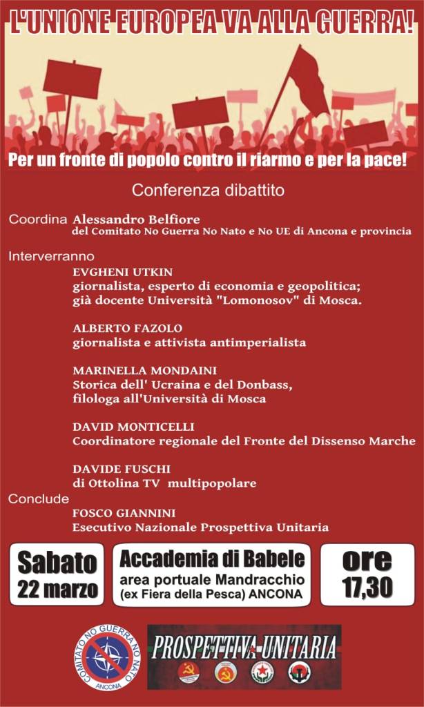 “L’Unione europea va alla guerra!”. Questo è il titolo dell’importante convegno pubblico che Prospettiva Unitaria per il partito comunista e NO guerra NO Nato hanno organizzato ad Ancona per sabato 22 marzo, dalle ore 17.30 presso la grande sala (circa 200 posti) dell’Accademia di Babele, nell’area portuale del Mandracchio. Preso atto della vittoria militare conseguita sul campo da parte della Federazione Russa contro l’Ucraina fascista ed il vasto fronte politico, economico e militare Usa-Nato-Gran Bretagna e Australia, Trump ha ritirato gli Usa dal fronte ucraino e proposto un progetto di pace tra Kiev e Mosca, una pace che dovrà basarsi, anche per gli Usa, su di almeno due fatti centrali: i territori russi riconquistati militarmente da Mosca (a cominciare dalla Crimea e dal Donbass) faranno parte della Federazione Russa e l’Ucraina non entrerà nella Nato. Vediamo in questa fase come la linea di Trump volta alla fine del conflitto abbia spinto l’Ue (sempre più segnata dalla propria, storica, russofobia) ad una folle e pericolosissima politica di riarmo e di guerra (800 miliardi di euro per “Rearm Europe”, scudo atomico francese e britannico per tutta l’Ue e potente riarmo tedesco sino all’ipotesi di una Germania con arsenale atomico). Ed è di tutto ciò che si parlerà al convegno di Ancona del prossimo 22 marzo, convegno che non si limiterà all’analisi del quadro internazionale, ma che soprattutto porrà il problema di una lotta di massa contro il riarmo e contro la linea di guerra dell’Ue. E non è infatti un caso il sottotitolo del convegno stesso: “Per un fronte di popolo contro il riarmo e la pace!”.