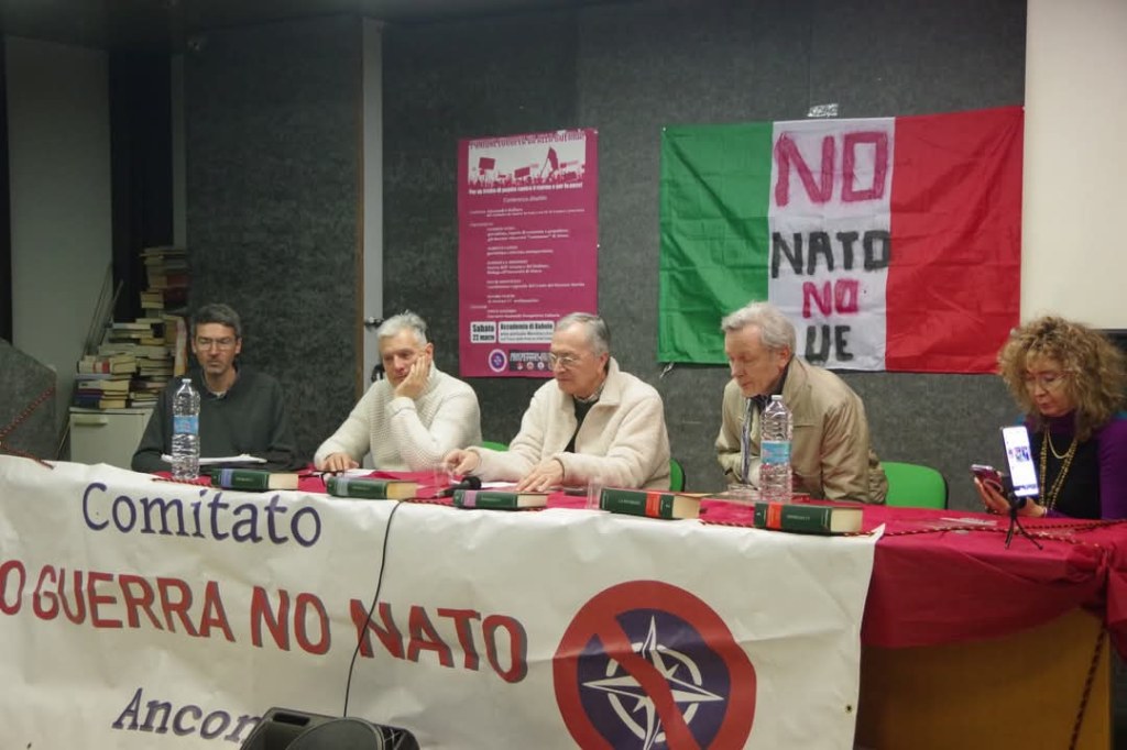 Sabato 22 marzo, ad Ancona, importante e molto partecipata conferenza-dibattito dal titolo L’unione europea va alla guerra! Per un fronte di popolo contro il riarmo e per la pace!, organizzata da Prospettiva Unitaria con il Comitato No guerra No Nato e No Ue; incontro coordinato da Alessandro Belfiore, dello stesso Comitato, e durante il quale sono intervenuti: Marinella Mondaini, filologa all’Università di Mosca e storica dell’Ucraina e del Donbass; Alberto Fazolo, giornalista ed attivista antimperialista; Evgheni Utkin, giornalista, esperto di economia e geopolitica, già docente Università “Lomonosov” di Mosca; Davide Fuschi, di Ottolina TV multipolare; David Monticelli, coordinatore regionale del Fronte del Dissenso Marche, con le conclusioni di Fosco Giannini, coordinatore nazionale del Movimento per la Rinascita Comunista e dell’Esecutivo nazionale di Prospettiva Unitaria.