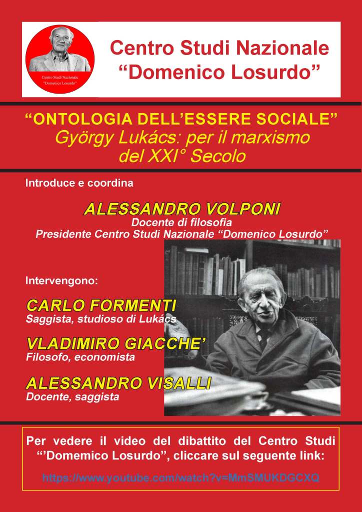 Il convegno on-line che presentiamo è stato, tra l’altro, il quarto di una serie organizzata dal Centro Sudi “Domenico Losurdo” sul pensiero e, più specificatamente, sulla grande opera di György Lukács “L’Ontologia dell’Essere Sociale”, con le tre prime parti (tutte usufruibili, visualizzabili, come questa quarta, sul canale You Tube del Centro Studi “Domenico Losurdo”) condotte dal professor Carlo Formenti.