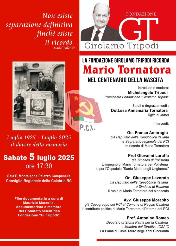 La Fondazione Girolamo Tripodi, insieme ai familiari, ha indetto per Sabato 5 luglio un incontro per ricordare la figura di Mario Tornatora, nella ricorrenza del centenario della sua nascita.