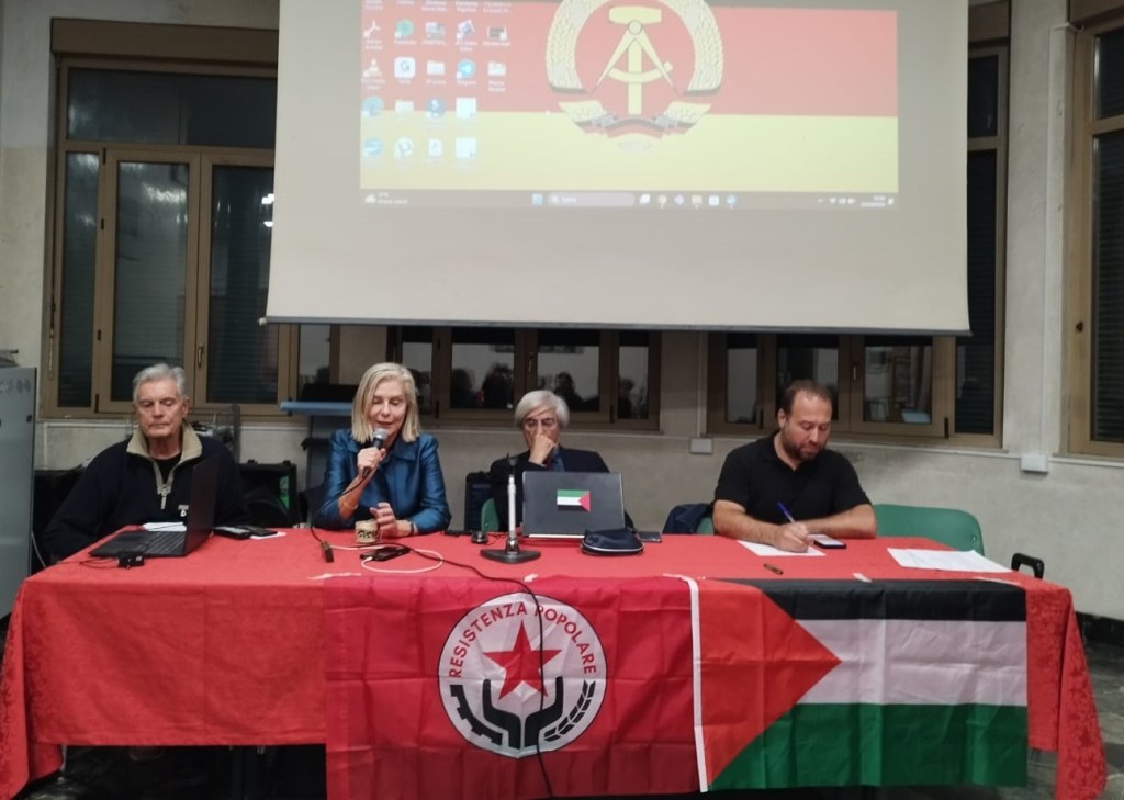 Conclusioni del dibattito affidate a Fosco Giannini, coordinatore nazionale del MpRC e del gruppo dirigente nazionale di “Uniti per il Partito Comunista”: “Nelle vecchie sezioni del PCI storico, anche in quelle di sperduti paesini di montagna, se all’ordine del giorno vi fossa stata la chiusura del mattatoio sotto casa, il segretario iniziava sempre parlando del contesto internazionale, poiché da lì, dal contesto internazionale, ogni cosa deriva. E dobbiamo dunque chiederci in quale quadro internazionale si colloca il genocidio israeliano contro il popolo palestinese, la ferocia, non solo impunita ma anche sollecitata, di Israele. Il contesto è il seguente: il 26 dicembre del 1991 viene ammainata la gloriosa bandiera sovietica dalle cupole del Cremlino. L’Unione Sovietica si auto dissolve e ciò cambia il mondo. I cantori dell’imperialismo affermano che, dopo la scomparsa dell’URSS, la “Storia è finita”. Ma in un lampo storico il mondo cambia radicalmente: attorno al titanico sviluppo economico cinese si unisce un grande polo mondiale dal carattere antimperialista. Nel 2009 si costituiscono i BRIC, che nel 2010 diventano, con l’ingresso del Sud Africa, i BRICS. L’America Latina è scossa da grandi rivoluzioni socialiste e antimperialiste. In tante aree dell’Africa e dell’Asia si aprono processi rivoluzionari e antimperialisti. I rapporti di forza internazionali mutano a sfavore del fronte imperialista, che inizia sempre più a temere il proprio declino e perde a mano a mano le zone mondiali di influenza. Ed è in questo contesto che va collocata la questione di Israele, che per gli Usa soprattutto, e anche per l’Ue, diviene sempre più il “cane da guardia”, armato sino ai denti e con 60 testate nucleari, che deve comandare, a nome di Washington, nella regione nevralgica del Medio Oriente. Per questo disegno il popolo palestinese può essere sacrificato. Può essere sterminato, con le armi Usa, dell’Ue, dell’Italia, come vuole Israele”. E prosegue, Giannini: “Detto ciò in modo preliminare, andiamo ad alcune riflessioni per poi giungere a cosa dobbiamo fare oggi. Partiamo da due questioni: primo punto: l’enfasi, il carnevale mediatico mondiale sul Piano Trump organizzato prima alla Knesset e poi in Egitto, a Sharm el – Sheikh, nei quali appuntamenti, proprio grazie alla grancassa internazionale, si è tentato di rimuovere, di cancellare dalla storia il genocidio israeliano a Gaza, i circa 65 mila morto gazawi, gli orrori sionisti, tutte le macerie di Gaza, la scomparsa stessa di Gaza, tutti i fronti di guerra e gli assassini di guerra sionisti perpetrati, solo in questi ultimi mesi, su tutti questi fronti: Libano, Siria, Yemen, Qatar, Iran. Secondo punto: la nostra totale contrarietà al piano Trump, un piano dal carattere chiaramente imperialista e neocolonialista. Col piano Trump si ratificano quattro progetti da “imperialismo da cuore di tenebra”:
