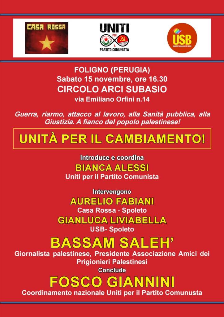 I compagni umbri, attraverso un grande lavoro di relazioni politiche e sociali, hanno organizzato un’iniziativa che, proprio nella sua forma, anticipa il Partito Comunista unitario che Uniti per il Partito Comunista vuole mettere in campo. Sabato 15 novembre alle ore 16.30, infatti, a Foligno, presso il Circolo ARCI di Subasio, al Convegno che si terrà (dal titolo esplicativo: “Guerra, riarmo, attacco al lavoro, alla Sanità pubblica, alla Giustizia. A fianco del popolo palestinese – Uniti per il cambiamento”) parteciperanno, assieme ad Uniti per il Partito Comunista, la “Casa Rossa” di Spoleto e la USB di Spoleto. Ad aprire il Convegno e a coordinarlo sarà la compagna Bianca Alessi, di Uniti per il Partito Comunista – Umbria; per la “Casa Rossa” di Spoleto (che molto lotta in difesa della Sanità pubblica) vi sarà Aurelio Fabiani e per la USB di Spoleto Gianluca Liviabella. Poiché, nel Convegno, centrale sarà la questione palestinese, vi sarà la presenza prestigiosa, al dibattito, del compagno Bassam Saleh’, giornalista palestinese e combattente storico della causa palestinese. Il Convegno sarà concluso da Fosco Giannini, Coordinatore nazionale del Movimento per la Rinascita Comunista e membro del Coordinamento nazionale di Uniti per il Partito Comunista.