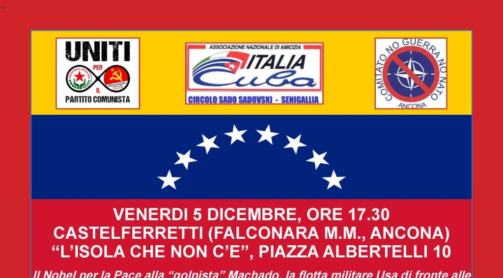 Straordinaria iniziativa pubblica, venerdì 5 dicembre, dalle ore 17.30, a Castelferretti (Ancona), nella sede dell’Associazione culturale “L’isola che non c’è, sul tema: Venezuela: contro il ‘golpe’ degli Usa mobilitazione popolare in difesa della Rivoluzione chavista. Organizzato dal Movimento per la Rinascita Comunista e da Resistenza Popolare, il Convegno si svolge di fronte ad un vasto pubblico, che riempie ogni angolo della pur vasta sala dell’Associazione culturale. Il dibattito è aperto e presieduto da Monica Natali (dirigente nazionale di Resistenza Popolare e del Coordinamento nazionale di “Uniti per il partito comunista”). La compagna Natali, tratteggiato il contesto internazionale attuale, mette a fuoco i motivi di fondo dai quali prende corpo il chiaro intento golpista statunitense contro la Rivoluzione venezuelana: la “riconsegna” del petrolio e delle ricche materie prime venezuelane alle multinazionali Usa e l’eliminazione di un Paese socialista che oggi, con Cuba e il Nicaragua, è un punto di riferimento per tutti i Paesi dell’America Latina che vogliono liberarsi dal tallone di ferro nordamericano. La Natali rimarca anche il grande successo dell’Appello in difesa del Venezuela lanciato dal Movimento per la Rinascita Comunista e da Resistenza Popolare, Appello che per i 70 prestigiosi promotori, le centinaia di importanti adesioni on line provenienti da tutto il mondo e le migliaia di adesioni è stato inviato, dall’Ambasciata del Venezuela, al governo e ai media del Venezuela. Dopo il saluto al gruppo di compagni dell’Associazione di Amicizia Italia-Cuba, che hanno organizzato il loro banchetto in sala, la Natali passa la parola a Laura Baldelli, che legge il bellissimo saluto al convegno da parte di Maria Elèna Uzzo Giannattasio, Capo Missione dell’Ambasciata della Repubblica Bolivariana del Venezuela, facente funzioni di Ambasciatrice.