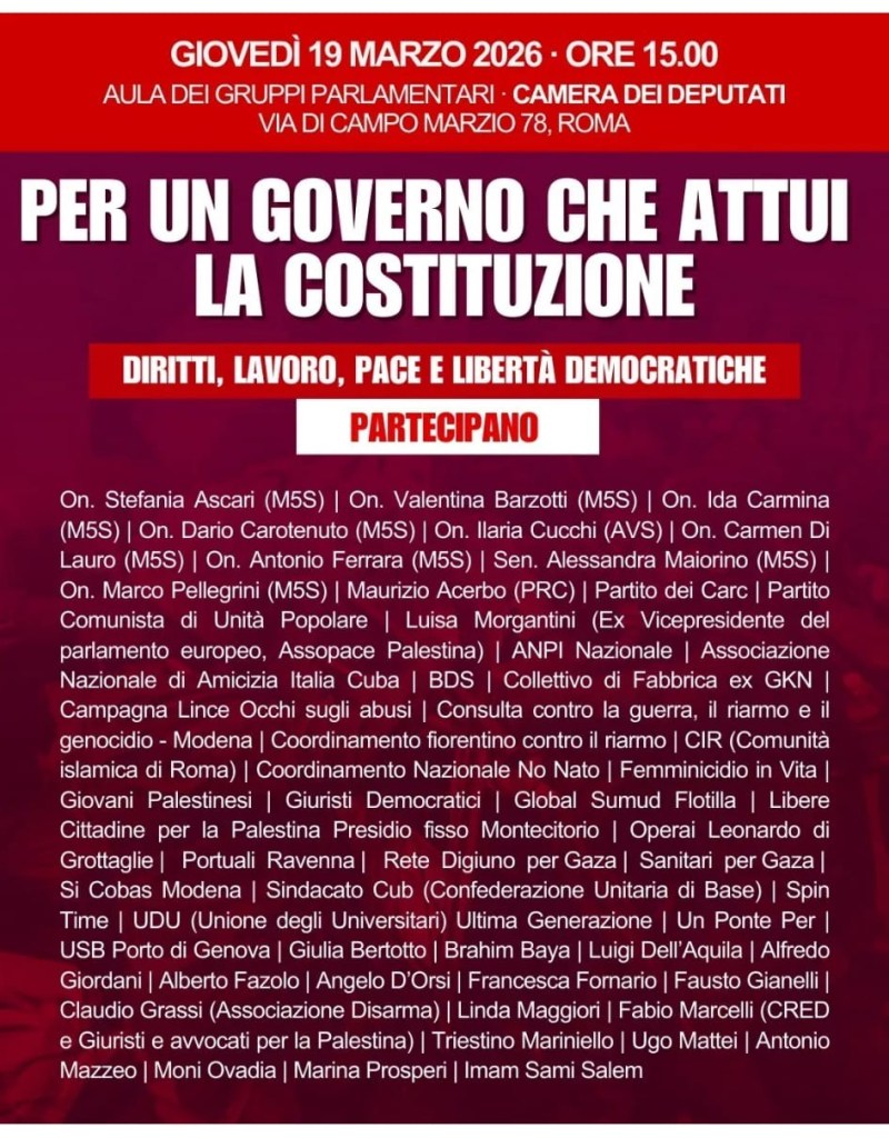 Come Partito Comunista di Unita Popolare ringraziamo gli organizzatori di questo convegno che a nostro avviso assume ,in questo frangente politico nazionale e internazionale una grande importanza ancorandosi ai valori fondanti della costituzione italiana cerchi di costruire uno strumento utile a far avanzare le condizioni economiche sociali e politiche della classe lavoratrice ,di chi vive del proprio lavoro ,della maggioranza del popolo italiano.