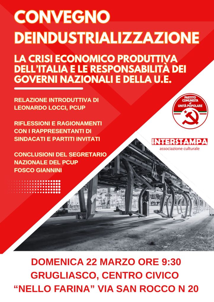 Oggi, 22 marzo si è svolto presso il centro civico “Nello Farina” di Grugliasco il convegno proposto dal PCUP sul tema. “Deindustrializzazione, la crisi economico produttiva dell’Italia e le responsabilità dei governi nazionali e della UE”