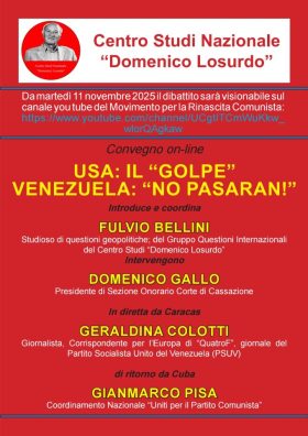 Convegno del Centro Studi Nazionale Domenico Losurdo: USA “Il golpe” Venezuela:”No pasaran!”. Con Fulvio Bellini, Domenico Gallo, Geraldina Colotti e Gianmarco Pisa.
