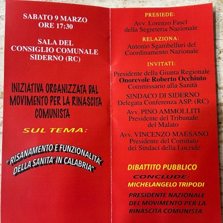 Sabato 9 marzo ore 17.30 a Siderno (Rc) Iniziativa MpRC sulla Sanità in Calabria