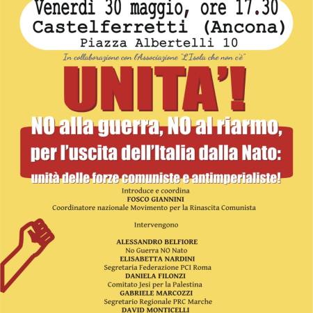 UNITA’! MpRC, Resistenza Popolare, partiti comunisti e forze antimperialiste: Castelferretti (Ancona), venerdì 30 maggio, contro la guerra e per l’uscita dell’Italia dalla Nato, prove di lotta unitaria